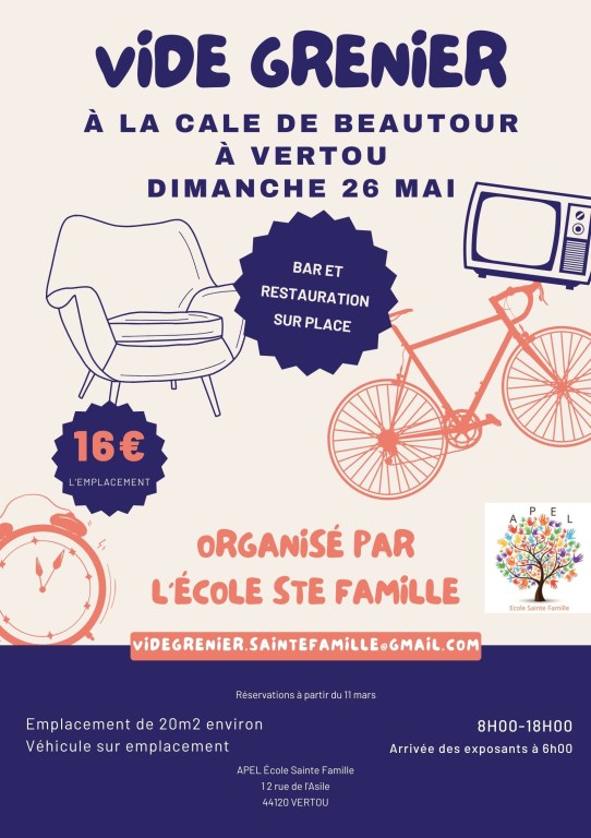 Vide grenier de l'APEL de l'école Sainte Famille de Vertou - Beautour le dimanche 26 mai 2024 à la cale de Beautour (parc en bord de Sèvre).