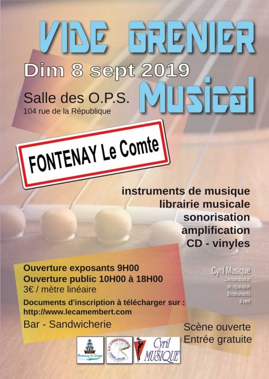 Dimanche 8 Septembre, FONTENAY LE COMTE (Vendée, 85200), Vide Grenier Musical organisé par le Camembert, Salle des O.P.S., 104 rue de la République