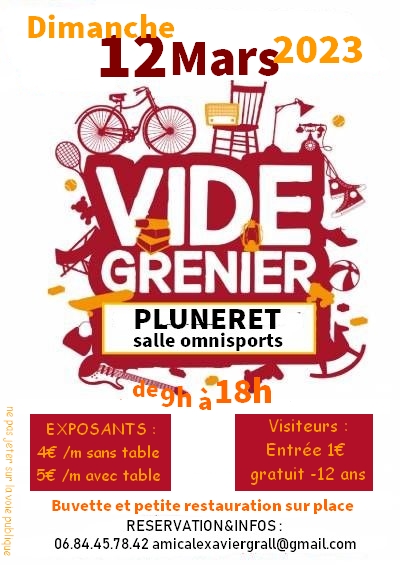 L'amicale de l'école publique Xavier Grall de Mériadec organise un vide-grenier le dimanche 12 mars 2023 de 9h à 18h à la salle omnisports de Pluneret