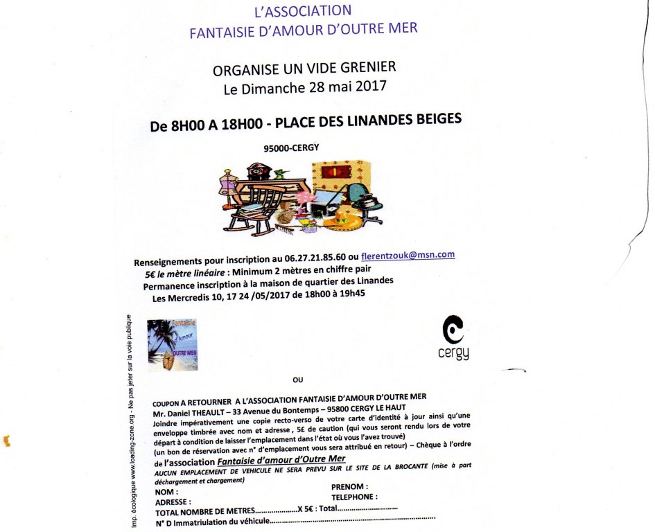 l'association fantaise d'amour d'outre-mer organise un vide-greniers le dimanche 28 mai 2017 de 8h à 18h à la place des linandes beiges à cergy 95000. Pour tout renseignement 0627218560 ou 0613144761. 5£ le mètre linéaire minimum, 2 mètres en chiffre pair. Permanence d'inscription les mercredis 10, 17, 24 mai 2017 de 18h à 19h45 ou, écrire à association fantaisie d'amour d'outre-mer, monsieur Daniel THEAULT 33, avenue du Bontemps 95800 cergy. Joindre IMPERATIVEMENT votre pièce d'identité ainsi qu'une enveloppe timbrée avec nom et adresse, 5£ de caution (qui vous seront rendu lors de votre départ à condition de laisser l'emplacement dans l'état où vous l'avez trouvé). (un bon de réservation avec n° emplacement vous sera attribué en retour)-chèque à l'ordre de l'association Fantaisie d'amour d'outre-mer. Aucun emplacement de véhicule ne sera prévu sur le site (mise à part déchargement et chargement)- Il y a des parkings gratuit à proximité