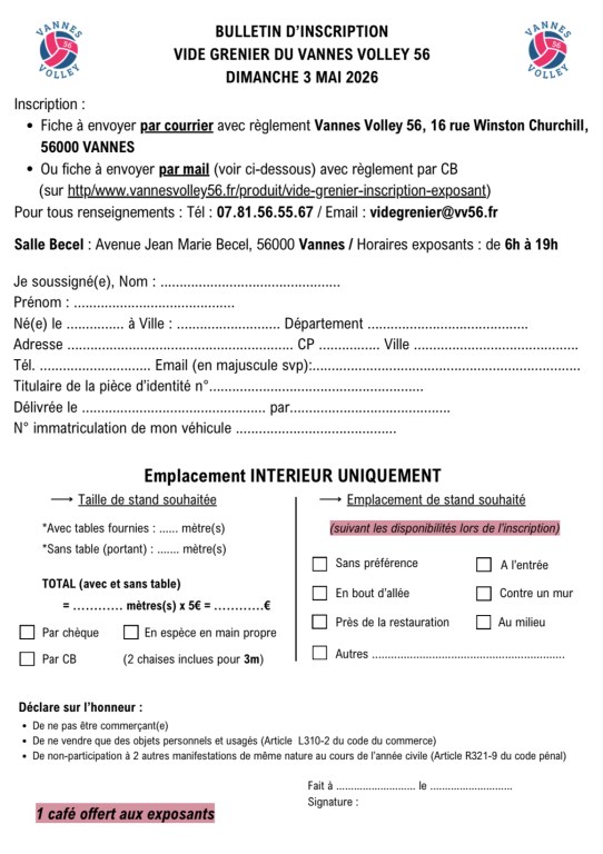 Contact et réservation : 07 81 56 55 67, videgrenier@vv56.fr, https://www.vv56.fr/produit/vdg-exposant