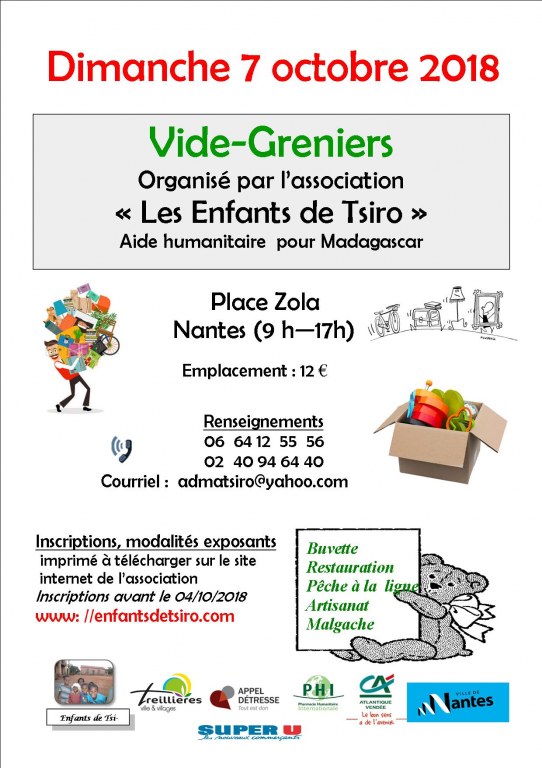 VIDE-GRENIERS. 180 exposants. Organisé par l'association les Enfants de Tsiro (soutien humanitaire à Madagascar) Place Zola à Nantes.