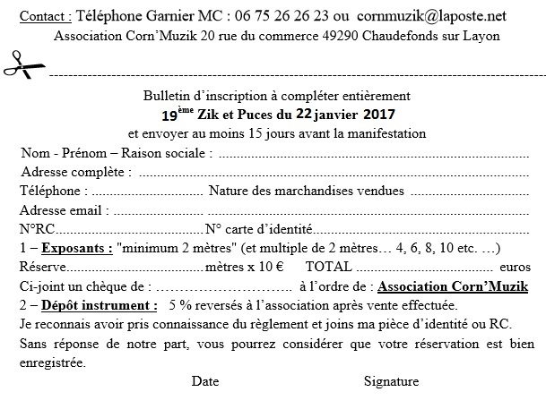 exposants remplir le bulletin de participation qui est sur le site http://corn.e-monsite.com/ et le retourner rapidement contacter Marie-Claire cornmuzik@laposte.net ou cornmuzikmarieclaire@orange.fr